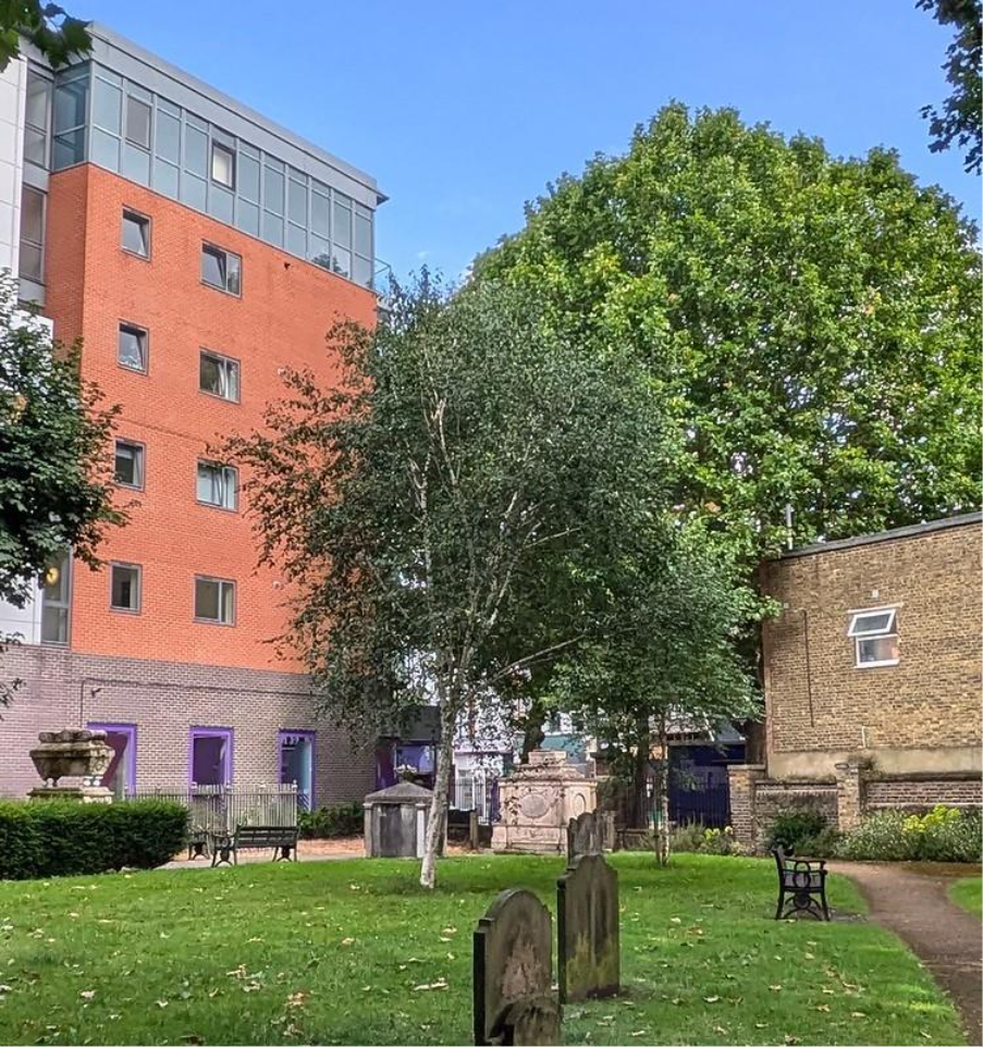 The burial ground is home to six very large London Plane trees and another six equally large oak trees, likely planted when the burial ground closed in 1854. There are a couple of birch trees and a fir tree. There are lots of various bushes, including holly, mosses and ferns around the burial ground. Stag beetles have also apparently been spotted there. (10).