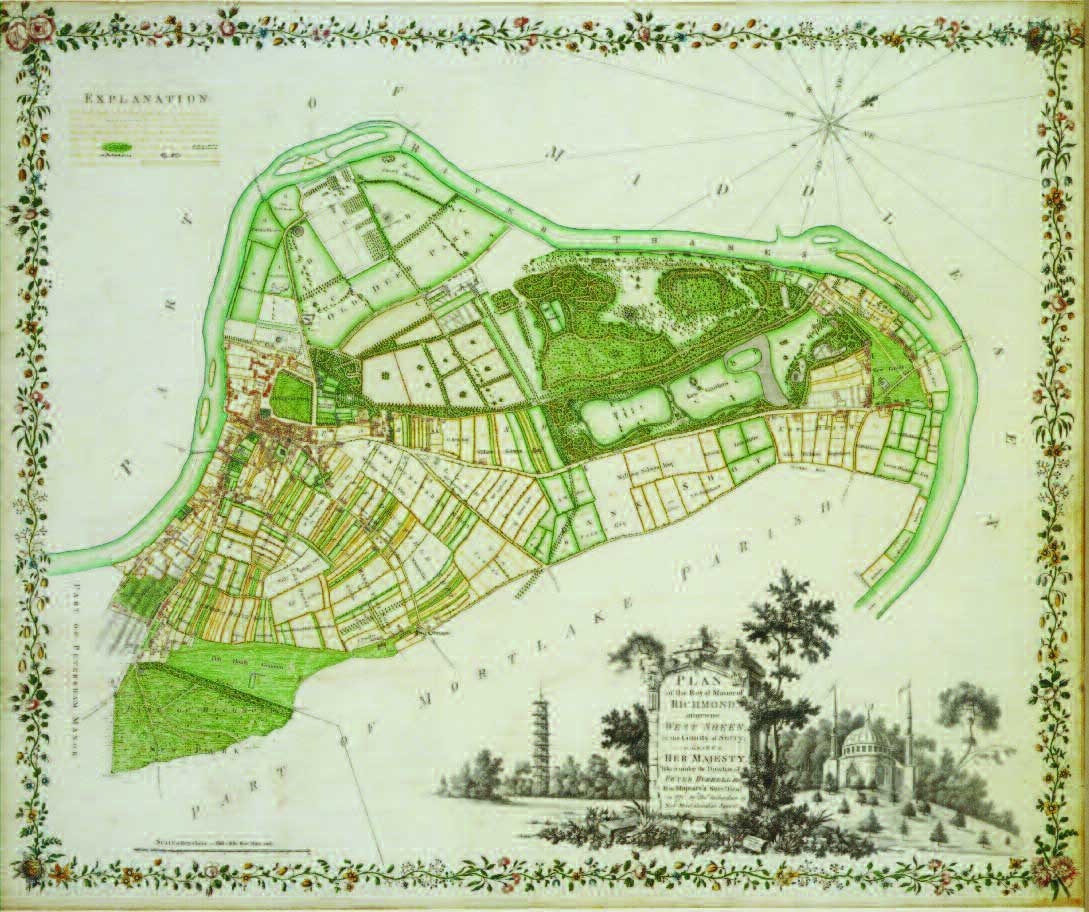 It is difficult now to judge the success and the extent of Brown’s work for George III: the scheme was never fully implemented, and the subsequent changes and overlays of the last 250 years have confused the picture; but the map evidence survives in the form of Brown’s plan for re-landscaping Richmond Gardens dated 10 December 1764 [Fig.2] and in the Plan of the Royal Manor of Richmond by Thomas Richardson, 1771. [Fig.4]