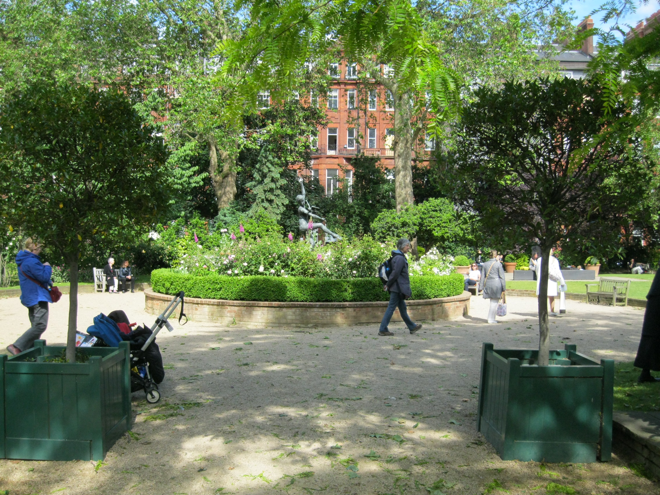 The garden has fine mature trees, areas of lawn, ornamental planting, roses, gravel paths, a rustic shelter and tennis courts. A circular planted feature has a figurative statue in its centre by David Wynne, 'Dancer with Bird', 1975 and a collection of David Austen roses. The garden suffered in the storms of 1987, losing many plane trees, and was subsequently replanted with ornamental trees. The southern garden enclosure is protected under the 1863 Garden Square Act. John Betjeman referred to the square in a poem praying for protection from WWII bombing: 'Lord, put beneath Thy special care, One-eighty-nine Cadogan Square'.