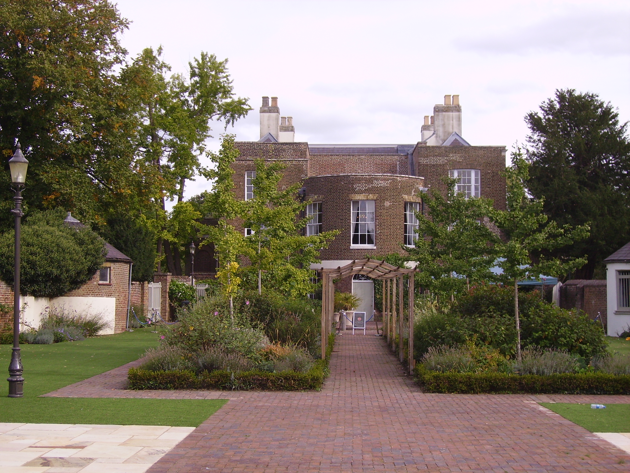 In 1945 Morden Park was purchased from the Hatfeild family by Merton and Morden UDC and the house and 90 acres were preserved as public open space, the house used as council offices. Behind the house is a courtyard and the remains of a crinkle-crankle wall. Two round single-storey outhouses were reputedly where deer slept in the winter. The courtyard used to have eight chestnut trees and a well, with a fig tree near the house. The walled garden is no longer in existence but one or two trees, including a large pear tree, may be a remnant of planting. The park consists of extensive parkland with mature trees grouped in copses and a continuous belt around the edges. A distinctive 40 feet mound within the park situated within woodland is believed to be a Romano-British burial mound, once used as a base for a summer house. A railed area is the site of an old velodrome. Among amenities added to the public park is an open air theatre with hedged enclosure. Part of the area is leased to the London Playing Fields Association. Trees for Cities, in partnership with Merton Council, have produced education packs for schools, and also installed interpretative boards with information about the park's history, archaeology and ecology.