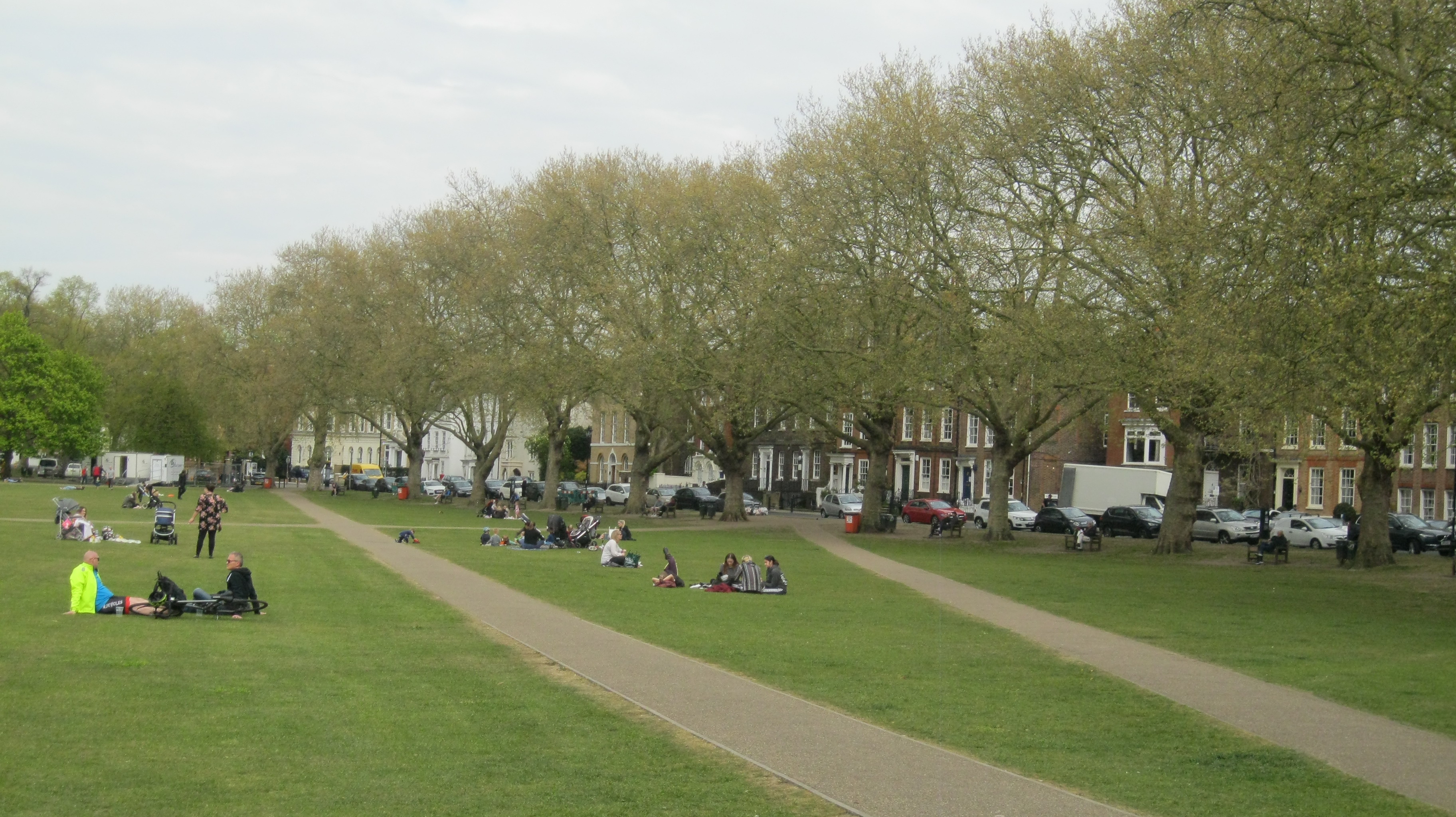 'One of the most beautiful urban greens surviving anywhere in England' (Pevsner), Richmond Green has been an important open space since medieval times when jousting tournaments and pageants took place here, although it was commonland which was used by villagers for grazing sheep. From the C14th the Lord of the Manor was the King and the Green was overlooked by Richmond Palace, then called Sheen or Shene Palace, occupied by monarchs until the late C17th. The Green is just outside the old palace gateway and linked the palace with the Old Deer Park (q.v.). A survey of 1649 described the Green as 20 acres of 'excellent land . . . Well turfed, level, and a splendid ornament to the palace. One hundred and thirteen elm trees, forty-eight whereof stand all together on the west side, and include in them a very handsome walk'. On the south-east side of the Green are late C17th and early C18th terraces of smart townhouses and Richmond continued to develop as a fashionable town, and in the C19th was a popular place for excursions. In 1861 Charles Dickens describes the Green in 'Great Expectations' where 'Some ancient trees before the house were still cut into fashions as formal and unnatural as the hoops and wigs and stiff skirts'.