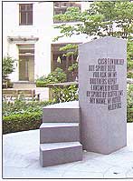 When I visited in 2002, this was a hard-landscaped open space with a few trees, raised beds and two or three eighteenth-century tombs, which had been laid out in 1960 by owners and occupiers of adjoining buildings. It has since been re-landscaped with new paving, seating and planting, and on 4 September 2008 a public sculpture was unveiled by Archbishop Desmond Tutu. Entitled 'Guilt of Cain', the work commemorates the abolition of the transatlantic slave trade in 1807 and is the creation of sculptor Michael Visocchi in collaboration with Lemn Sissay, whose eponymous poem is engraved into the granite columns and stepped podium that comprise the sculpture. The form is evocative of both a pulpit or a slave auctioneer's podium, the columns suggesting stems of sugar cane, a crowd or congregation.